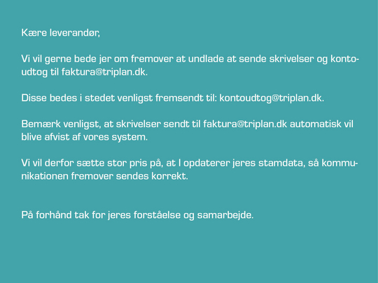 Sørg for at vores firmanavn er angivet som: Triplan International A/S på alle fakturaer.