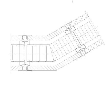 Horizontal section Flexica. 30° steel-covered corner joint in 100 mm wall between two double glass modules.
