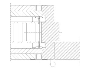 Vandret snit Flexica. Horisontal samling i 125 mm væg mellem gipsmodul og trækarm med massivdør.
