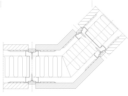 Vandret snit Ventura Open. 45° hjørnesamling i 100 mm væg mellem 2 gipsmoduler. Udvendigt hjørne i MDF, indvendigt hjørne i stål. 12 mm reces.